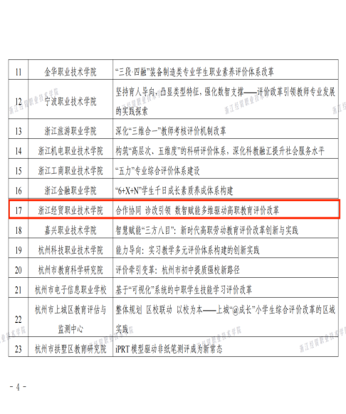 近日,浙江省第三批教育评价改革典型案例评选结果公布,我校报送的案例“合作协同、诊改引领、数智赋能、多维驱动高职教育评价改革”成功入选,这是学校在入选首批浙江省教育评价改革典型案例、开展教育评价改革试点校建设以来,在教育评价建设方面取得的又一成果。本次评选旨在深入贯彻落实《深化新时代教育评价改革总体方案》和《浙江省深化新时代教育评价改革实施方案》精神,及时总结、宣传、推广教育评价改革典型经验,经各地各校申报、专家评审,共有52个案例入选,其中高职10个。